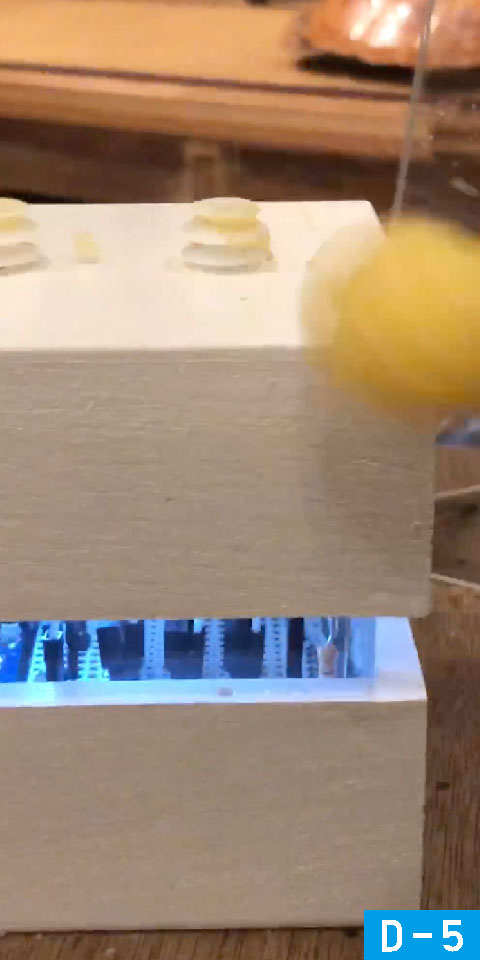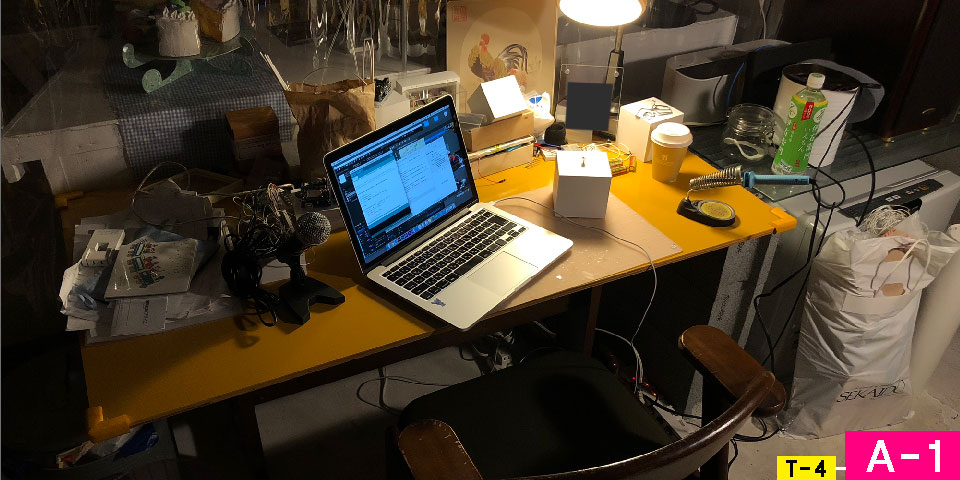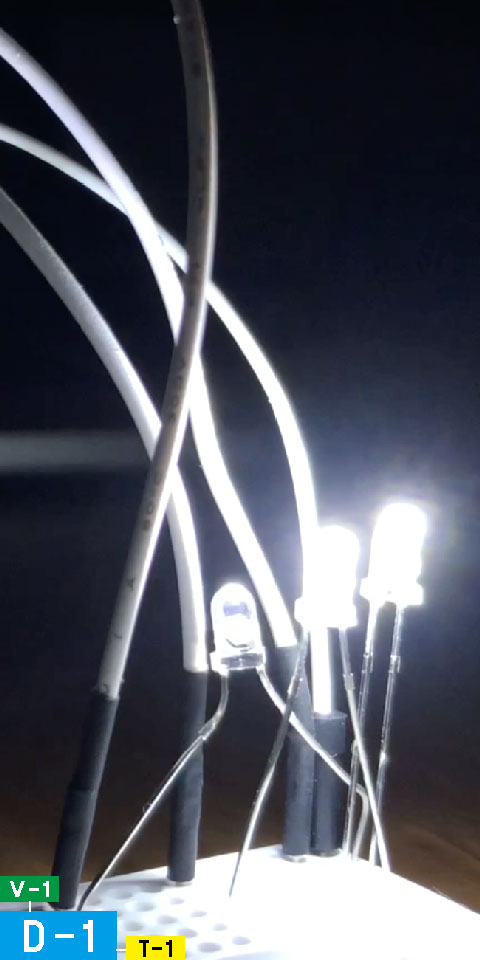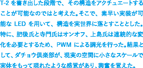 T-2を書き出した段階で、その構造をアクチュエートすることが可能なのではと考えた。そこで、素早い実装が可能なLEDを用いて、構造を実世界に落とすこととした。特に、肥後氏と寺門氏はオンオフ、上島氏は連続的な変化を必要とするため、PWMによる調光を行った。結果として、ダチョウ倶楽部が、現実の空間に小さなスケールで実体をもって現れたような感覚があり、興奮を覚えた。