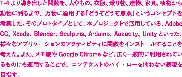 T-4より導き出した関数を、人やもの、衣服、乗り物、建物、家具、植物から動物に到るまで、万物に適用する「どうぞどうぞ無双」というコンセプトを考案した。そのプロトタイプとして、本プロジェクトで活用している、Adobe CC、Xcode、Blender、Sculptris、Arduino、Audacity、Unityといった、様々なアプリケーションのアクティビティに関数をインストールすることを考えた。また、メモ帳やGoogle Chromeなど、広く一般的に利用されているものにも適用することで、コンテクストのハイ・ローを問わない表現を目指す。