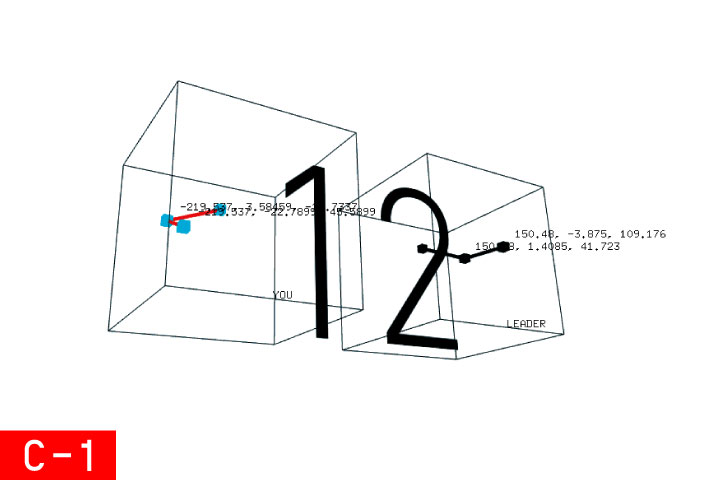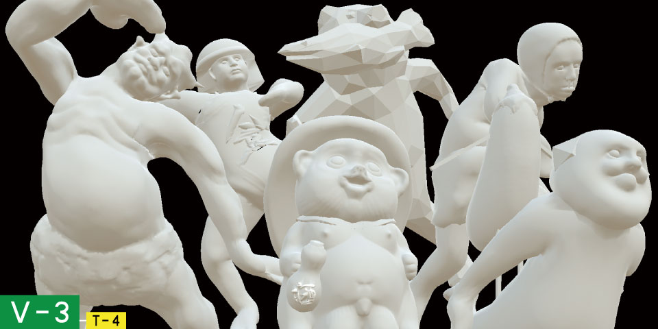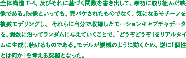 全体構造T-4、及びそれに基づく関数を書き出して、最初に取り組んだ映像である。映像といっても、完パケされたものでなく、気になるモチーフを複数モデリングし、それらに自分で収録したモーションキャプチャデータを、関数に沿ってランダムに与えていくことで、「どうぞどうぞ」をリアルタイムに生成し続けるものである。モデルが機械のように動くため、逆に「個性とは何か」を考える契機となった。