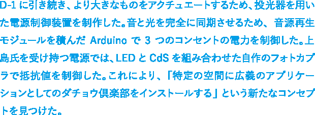 D-1に引き続き、より大きなものをアクチュエートするため、投光器を用いた電源制御装置を制作した。音と光を完全に同期させるため、音源再生モジュールを積んだArduinoで3つのコンセントの電力を制御した。上島氏を受け持つ電源では、LEDとCdSを組み合わせた自作のフォトカプラで抵抗値を制御した。これにより、「特定の空間に広義のアプリケーションとしてのダチョウ倶楽部をインストールする」という新たなコンセプトを見つけた。