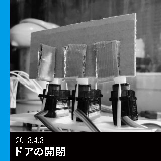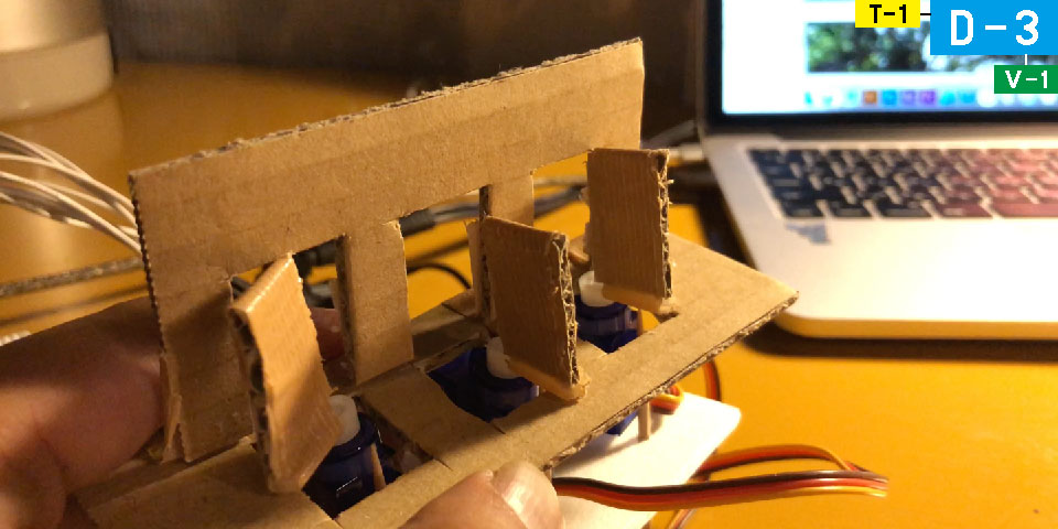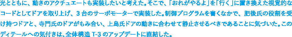 光とともに、動きのアクチュエートも実装したいと考えた。そこで、「おれがやるよ」を「行く」に置き換えた視覚的なコードとしてドアを取り上げ、3台のサーボモーターで実装した。制御プログラムを書くなかで、肥後氏の役割を受け持つドアと、寺門氏のドアがもみ合い、上島氏ドアの動きに合わせて静止させるべきであることに気づいた。このディテールへの気付きは、全体構造T-3のアップデートに直結した。