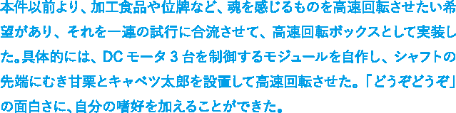 本件以前より、加工食品や位牌など、魂を感じるものを高速回転させたい希望があり、それを一連の試行に合流させて、高速回転ボックスとして実装した。具体的には、DCモータ3台を制御するモジュールを自作し、シャフトの先端にむき甘栗とキャベツ太郎を設置して高速回転させた。「どうぞどうぞ」の面白さに、自分の嗜好を加えることができた。