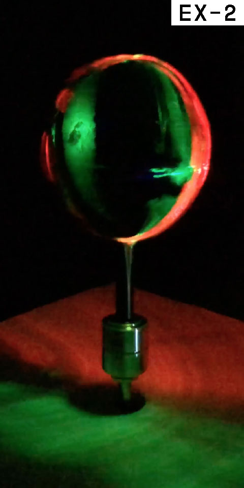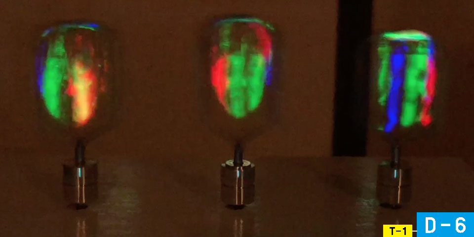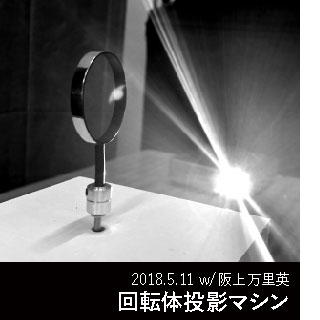 D-6の回転体投影を、彫刻・インスタレーション作家の同僚、阪上万里英氏に話したところ、先端部分を制作してくれた。投影面を大きく、鏡面にしたところ、床にも反射して美しい像を描いた。また、DLPプロジェクターの性質上、モーターの回転によって光をRGBにデコードすることがわかった。