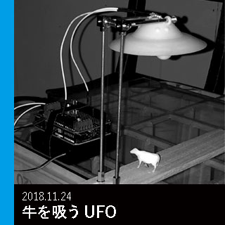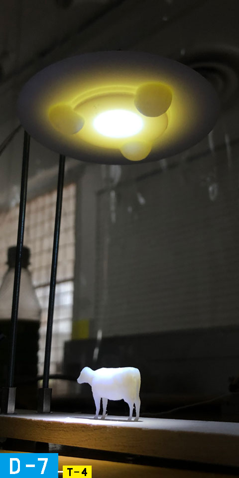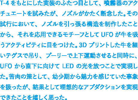T-4をもとにした実装のふたつ目として、噴霧器のアクチュエートを試みたが、ノズルがかたく断念した。その試行において、ノズルを引っ張る構造を制作したことから、それを応用できるモチーフとしてUFOが牛を吸うアクティビティに目をつけた。3Dプリントした牛を細いテグスで吊り、プーリーで上下運動させると同時に、UFOから直下に向けてLEDの光を放つことで実現した。苦肉の策として、幼少期から魅力を感じていた事象を扱ったが、結果として理想的なアブダクションを実現できたことを嬉しく思った。