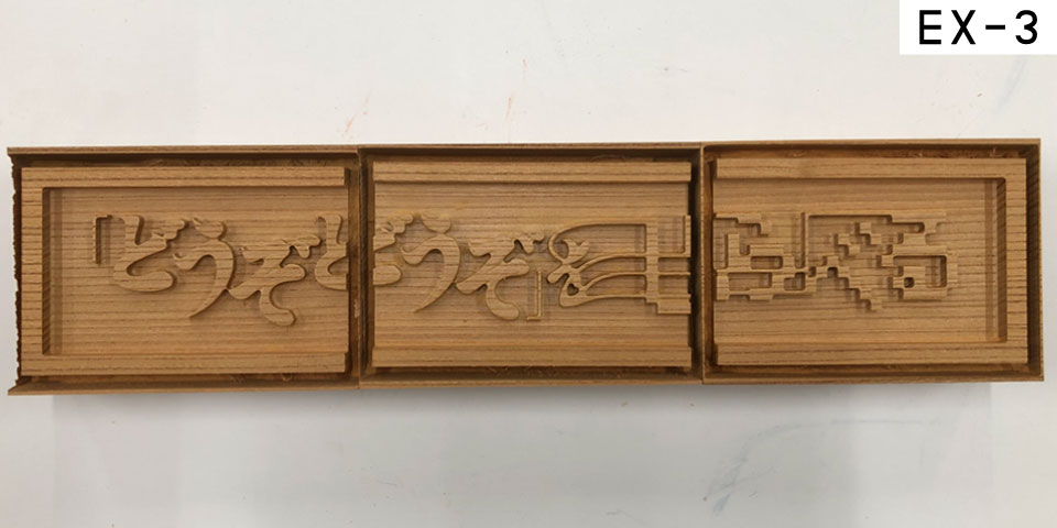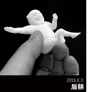 個展の開催に向けて会場を下見したところ、何かが足りない印象を受けた。その場でしばらく考えた結果、それが扁額であることに気付いた。そこで、ロゴを中心として見取り図のモチーフを額縁にあしらい、V-3でモデリングしたマーモセットを散りばめた扁額を設計した。中央部分と額縁は切削したケヤキ、マーモセット部分は3Dプリントした樹脂となる。元来、扁額は「お墨付き」の役割も担っていたことから、それを自分で与える意図で制作した。