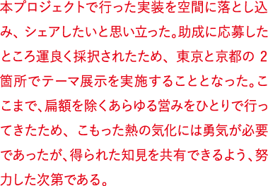 本プロジェクトで行った実装を空間に落とし込み、シェアしたいと思い立った。助成に応募したところ運良く採択されたため、東京と京都の2箇所でテーマ展示を実施することとなった。ここまで、扁額を除くあらゆる営みをひとりで行ってきたため、こもった熱の気化には勇気が必要であったが、またとない機会に得られた知見を共有できるよう、努力した次第である。