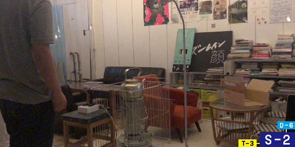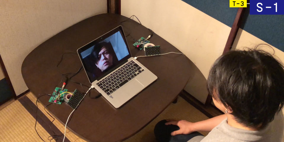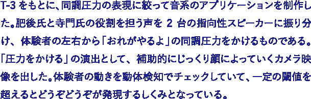 T-3をもとに、同調圧力の表現に絞って音系のアプリケーションを制作した。肥後氏と寺門氏の役割を担う声を2台の指向性スピーカーに振り分け、体験者の左右から「おれがやるよ」の同調圧力をかけるものである。「圧力をかける」の演出として、補助的にじっくり顔によっていくカメラ映像を出した。体験者の動きを動体検知でチェックしていて、一定の閾値を超えるとどうぞどうぞが発現するしくみとなっている。