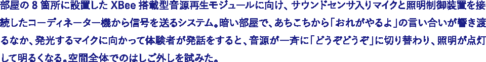 部屋の8箇所に設置したXBee搭載型音源再生モジュールに向け、サウンドセンサ入りマイクと照明制御装置を接続したコーディネーター機から信号を送るシステム。暗い部屋で、あちこちから「おれがやるよ」の言い合いが響き渡るなか、発光するマイクに向かって体験者が発話をすると、音源が一斉に「どうぞどうぞ」に切り替わり、照明が点灯して明るくなる。空間全体でのはしご外しを試みた。