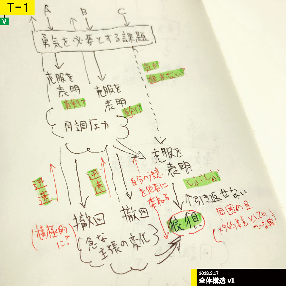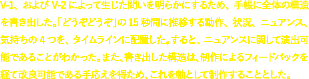 V-1、およびV-2によって生じた問いを明らかにするため、手帳に全体の構造を書き出した。「どうぞどうぞ」の15秒間に推移する動作、状況、ニュアンス、気持ちの4つを、タイムラインに配置した。すると、ニュアンスに関して演出可能であることがわかった。また、書き出した構造は、制作によるフィードバックを経て改良可能である手応えを得ため、これを軸として制作することとした。
