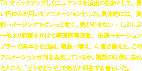 T-1でピックアップしたニュアンスを演出の指針として、黒い円のみを用いてアニメーション化した。具体的には、真剣→イージングでぐいっと動く、気が進まない・しぶしぶ→他より時間をかけて等速直線運動、迅速→モーションブラーで素早さを強調、狼狽→震え、に置き換えた。このアニメーションが何を表現しているか、複数の同僚に尋ねたところ、「どうぞどうぞ」であると即答する者もいた。