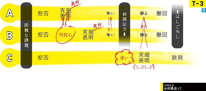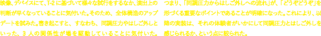 映像、デバイスにて、T-2に基づいて様々な試行をするなか、演出上の判断が早くなっていることに気付いた。そのため、全体構造のアップデートを試みた。書き起こすと、すなわち、同調圧力やはしご外しといった、3人の関係性が場を駆動していることに気付いた。つまり、「同調圧力からはしご外しへの流れ」が、「どうぞどうぞ」を形づくる重要なポイントであることが明確になった。これにより、以降の実装は、それの体験者がいかにして同調圧力とはしご外しを感じられるか、という点に絞られた。