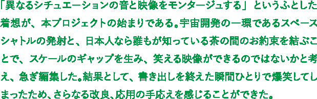 「異なるシチュエーションの音と映像をモンタージュする」というふとした着想が、本プロジェクトの始まりである。宇宙開発の一環であるスペースシャトルの発射と、日本人なら誰もが知っている茶の間のお約束を結ぶことで、スケールのギャップを生み、笑える映像ができるのではないかと考え、急ぎ編集した。結果として、書き出しを終えた瞬間ひとりで爆笑してしまったため、さらなる改良、応用の手応えを感じることができた。